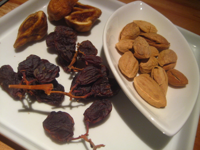 殻付きアーモンドと枝付き大粒の干しぶどう、イチジクの盛り合わせ600円。これ、超バリュー!