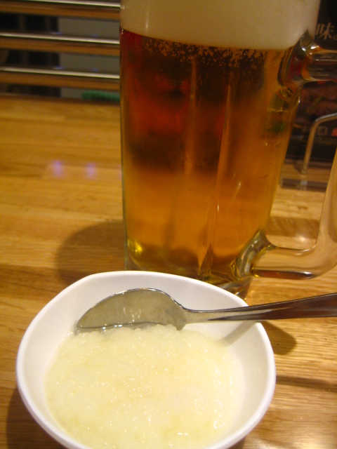 お通しは、大根おろしと鳥ガラスープ(200円)。ドリンクもボトル以外は今日まで全品100円!!