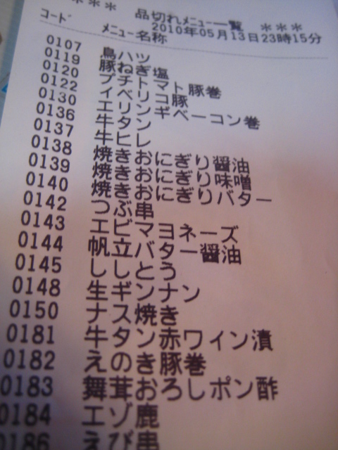 しかし、品切れのリストがずらずらずら~っと↓ 特にエゾ鹿肉の串、食べたかったけど、そらシカたないよね~