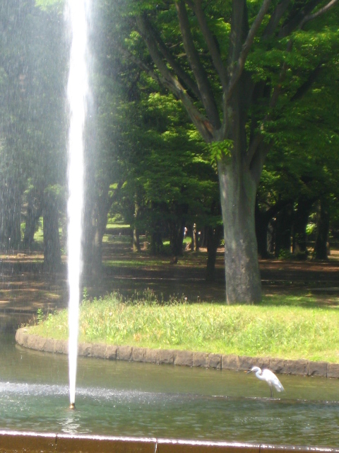 ここで初めて見たが、キレイなシラサギ?だって、噴水の周りから動かず、水しぶきを浴びていた。