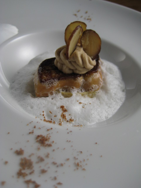 フォアグラ×栗に、シナモンがかかってます。濃厚なフォアグラに、ふわふわの泡がええ!!