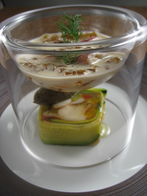 立体皿に、上から、オマールのコンソメジュレ、真ん中の黒っぽいのがアンチョビと茄子のタプナード、下は野菜のテリーヌ。なんとも美しい盛付け。ぷりっとしたオマールが最高!!