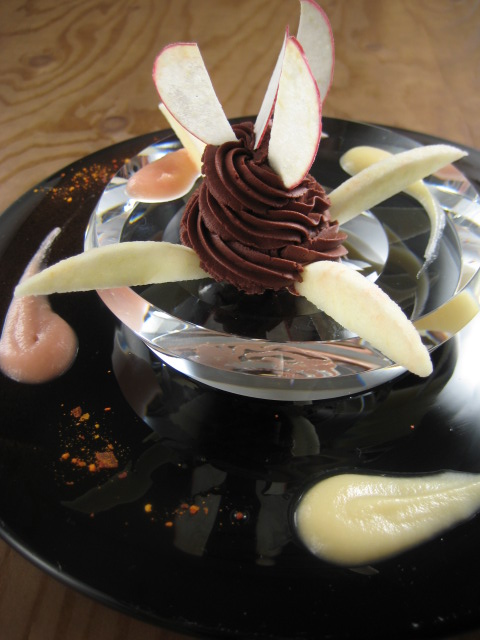 これは、一見チョコレートのデザートに見えるが、前菜!こんなブーダンなんて見たことない、、酸味のある林檎のソースが、引き立っている。バスク産の唐辛子がちりばめられているのも、嬉しいし非凡だ。因みにこの美しい器、ヴェーレというメーカーの特注だそう。