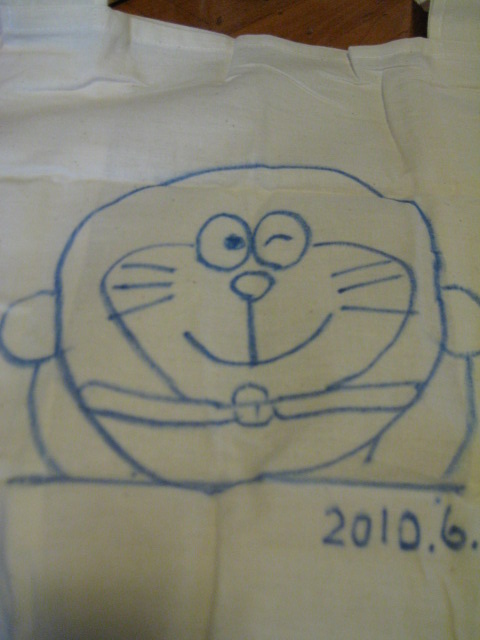 左のドラえもんを参考に、おまけで、無印良品でもらったECO BAGにお絵描きしたら。。。