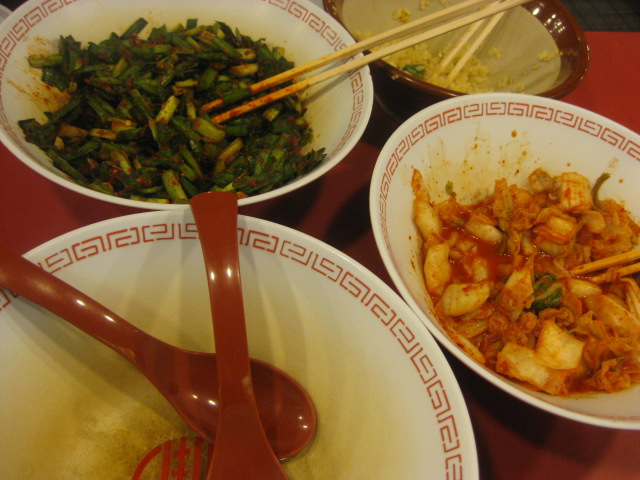 ラーメン(600円)は、「道頓堀神座」のような、辛い味付きのニラと、にんにく、キムチが無料・セルフでトッピング可。