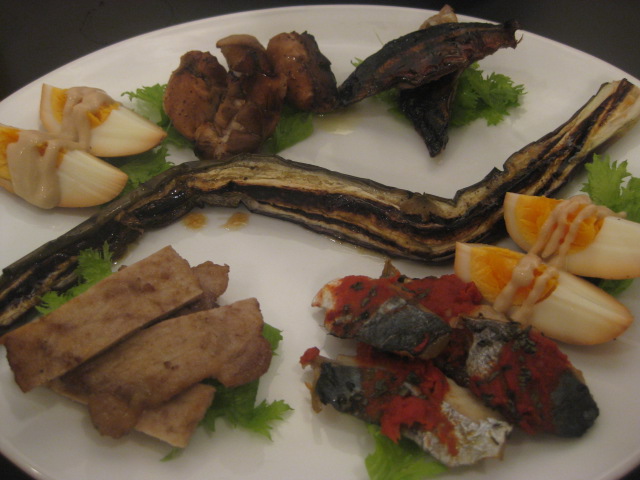 自家製スモークがウリ。左上から燻製玉子、鮭の白子の燻製、秋刀魚の燻製、中央は長茄子のグリル、サゴチのトマトソース、豚ロースの6点盛りとしてチョイス〈1人前900円×2〉4点600円から選べる、このシステムは楽しい。