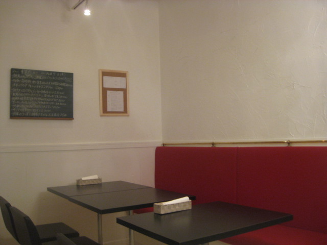 外観と一緒で、店内も白赤が基調。お通しはパンとチーズ。