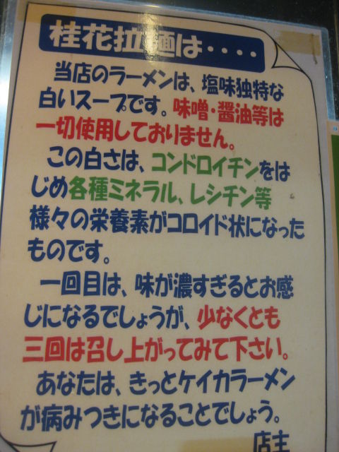 「1回目は味が濃すぎると感じるかもしれません。少なくとも3回は召しあがってみてください。あなたはきっと桂花が病みつきに・・・」