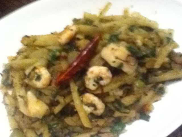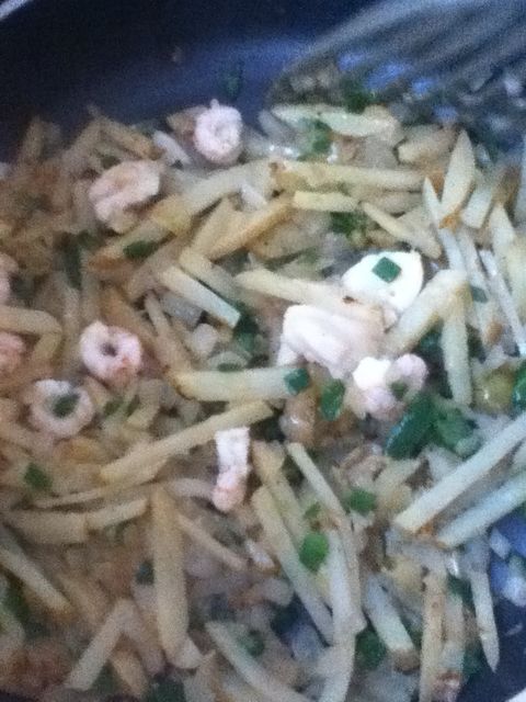 玉ねぎをみじん切り、じゃがいもは千切りにして炒め、途中でピーマンを追加!海老とホタテもあったのでついでに入れる!