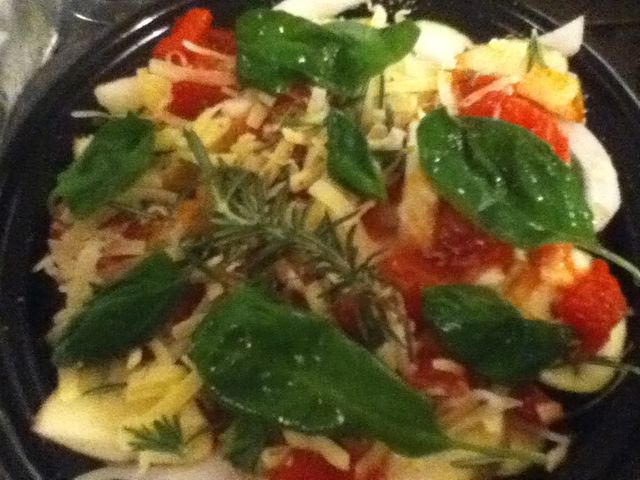 カットトマト缶1/2に、ガーリックなどのハーブスパイスMIXをベースにフレッシュバジルとローズマリー、なす、じゃがいも、玉ねぎ、野菜だけじゃあれなのでウインナー、とけるチーズ!