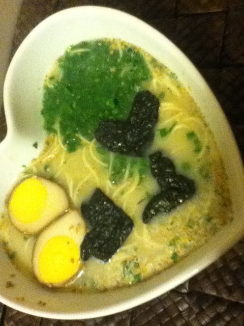 たまたま買った、煮卵もハート型だったんで・・・海苔もトッピン具!