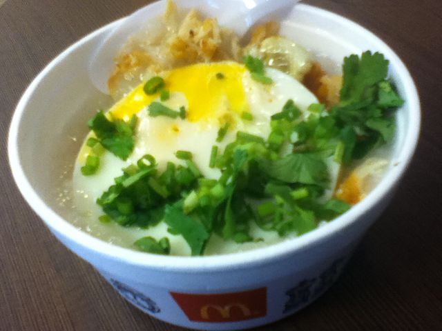 ピータン丸一個のジョーク。日本と違って病人食ではないため、めっちゃボリューミー、残した!朝マックにもある!豚もあるが、チキンのジョークに玉子トッピン具!