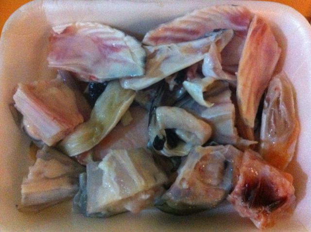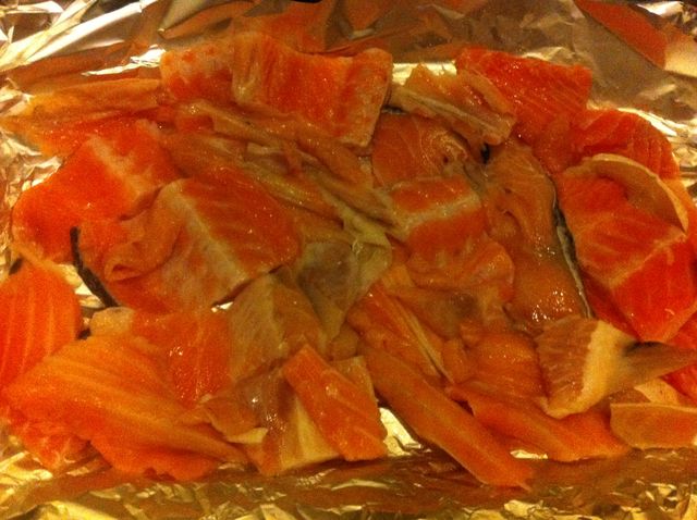 同様に色々使える鮭フレークも輸入で冷凍、塩だけで十分に美味しいのに、味の素の塊! なので日本にいた時からだが、鮭アラが売っていると、貧乏性の自分はつい買ってしまう。FUJIスーパーでは、1.2kが50B。アラと言っても切り身状のも入っていたりしたりしてお得!というだけでなく肉同様、魚も骨際のハラスはアロイ! まず、お頭部分などアラのアラは脂っぽすぎるし扱いにくいので若干勿体ないが捨てる。 フライパンで炒めるほうが早いが、岩塩を振ってオーブン2段にぎゅぎゅう敷き詰めて焼く。 あらほぐし鮭フレーク完成!手間はかかれど、安くて無添加、手間をかける楽しみも味わえる。