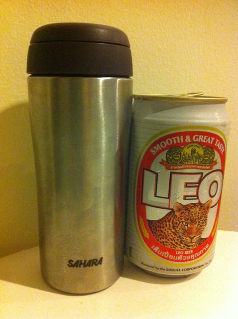 日本でもマイマグ、マイボトルと言って流行っているらしいが、タイでは室内でも冷たい飲み物があっという間にぬるくなるので、より必需品!お出かけ用のつもりが、家でも職場でも大活躍、夜も・・・缶ビールだけど、タイガー魔法瓶ビール(笑)!