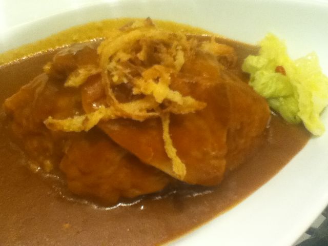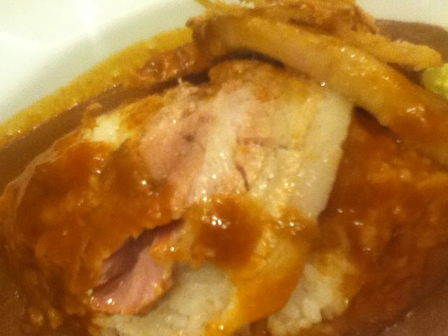 スタウトビールで、圧力釜で炊いたポーク、超柔らかい!私は脂身が苦手で常に残すのだけど、力なんか入れなくてもほろっとスプーンで分離できる柔らかさ!