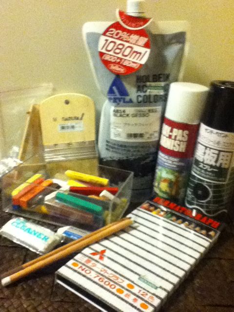 で、来週、真理さんが上京するまで待てず、今度こそ自分でやりたくなって、とうとう一昨日急きょ、オイルパステルほか大出費覚悟で、画材道具もろもろ一式を世界堂本店で揃え、チャレンジ!