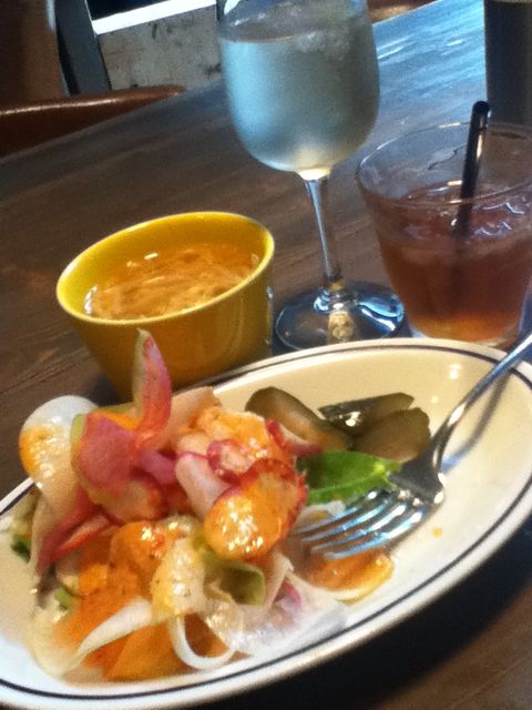 まず、おかわり自由のスープ、ドリンク、ワイン赤白に、“すごいサラダ”は、きれいで、ピクルス付き。